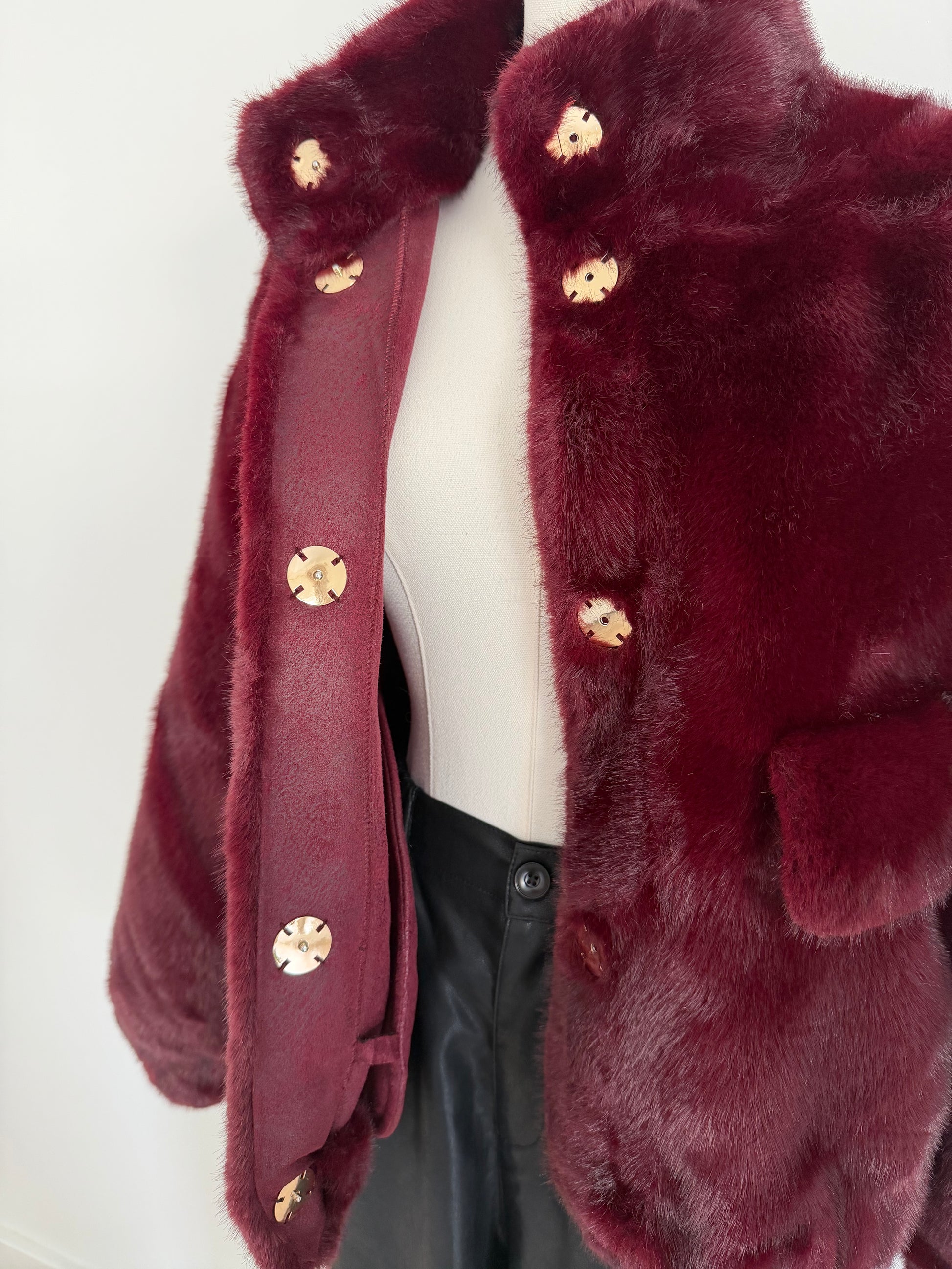 • Color: Burgundy with a soft, shiny faux-fur texture