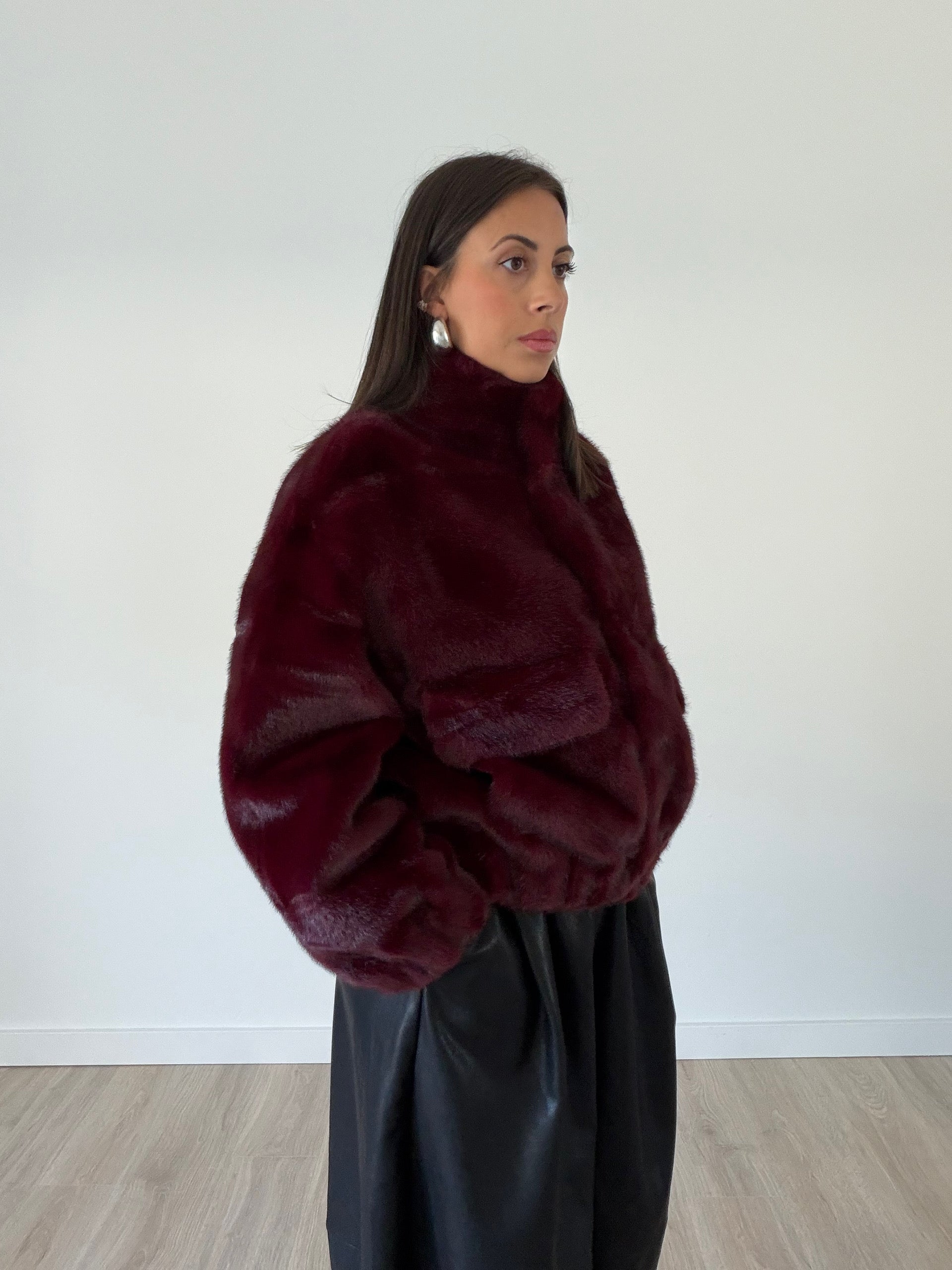 Elevate your everyday style with the Amarena bomber — a slightly oversized faux-fur jacket in a rich burgundy hue that blends chic sophistication with cozy comfort.