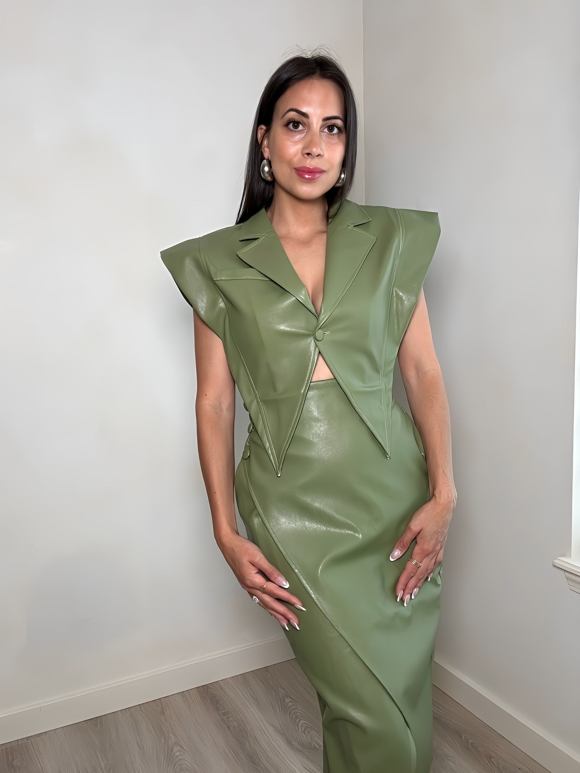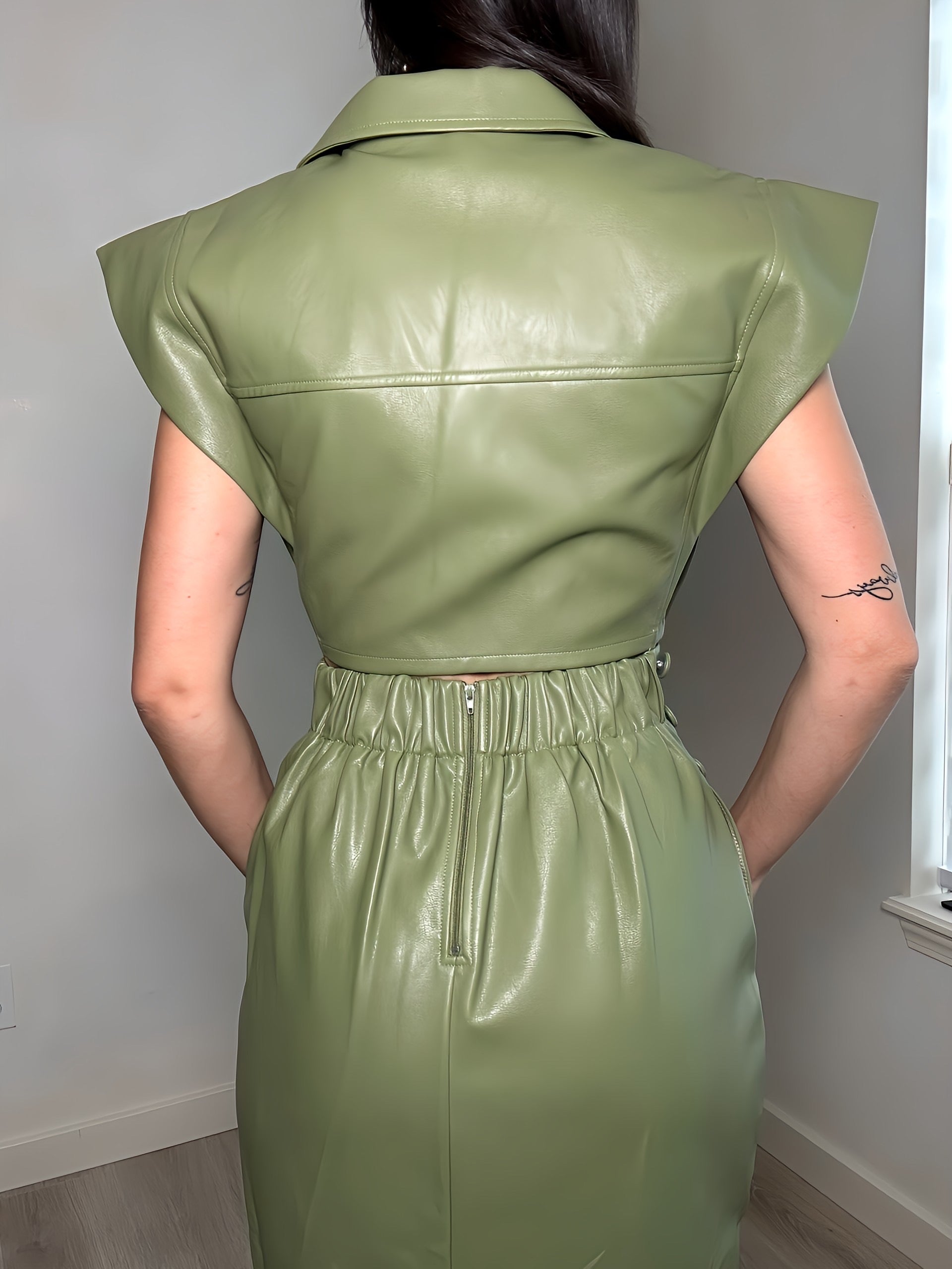 Elegant and versatile, this faux leather set includes a high-waisted skirt and cropped vest designed to elevate your style. Both pieces can be worn together for a bold statement or styled separately for endless looks — from casual chic to elevated evenings. The details and fit make it as comfortable as it is stylish.