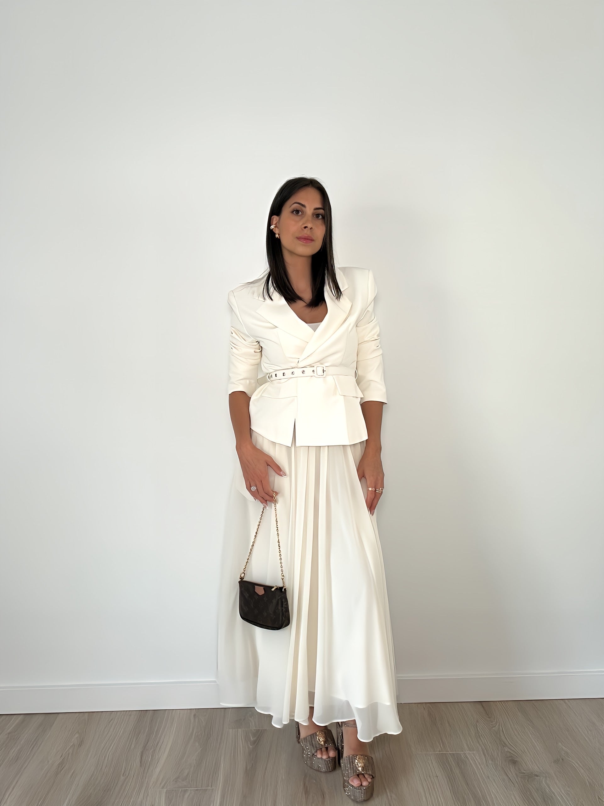 Style it with the matching skirt for a timeless, head-to-toe off-white look.