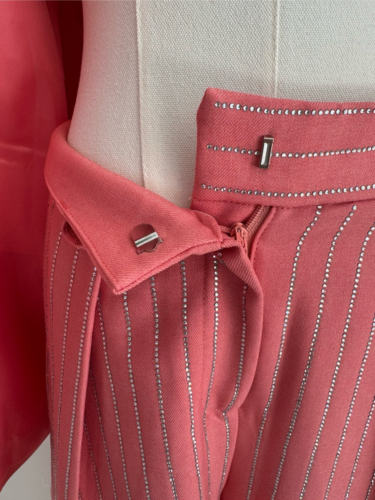 This pink/salmon striped suit is designed to dazzle with its all-over rhinestone embellishments. Whether worn as a full set or styled separately, it brings a chic statement to any outfit.